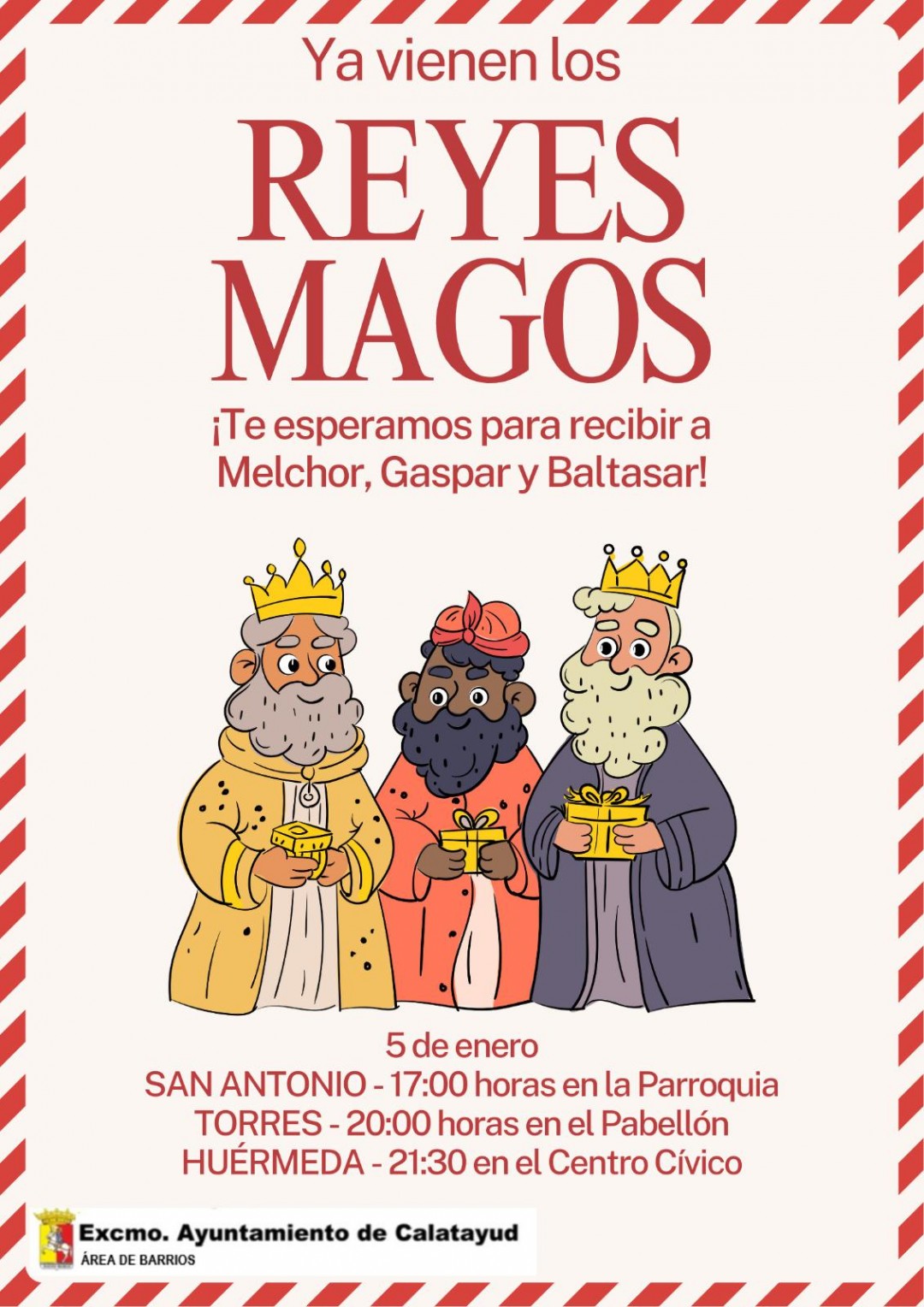 Melchor Gaspar y Baltasar pasarán antes por los barrios de San Antonio, a las 17.00 horas, y estarán en su parroquia. Al pabellón de Torres llegarán a las 20.00 horas, y a las 21.30 les esperarán también en el Centro Cívico de Huérmeda.