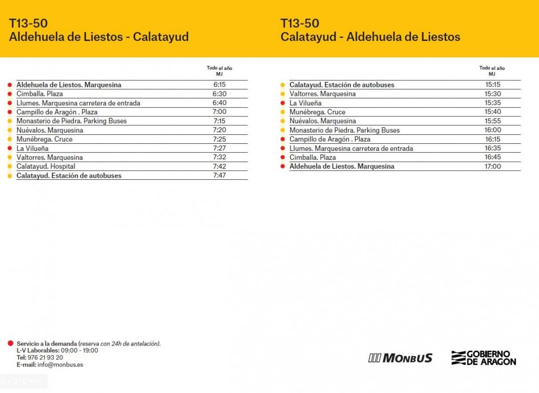 - T13-50 ALDEHUELA DE LIESTOS – CALATAYUD: Adelanta servicio de ida, pasando de ser a las 06.30 a las 06.15 Aldehuela – Calatayud.
