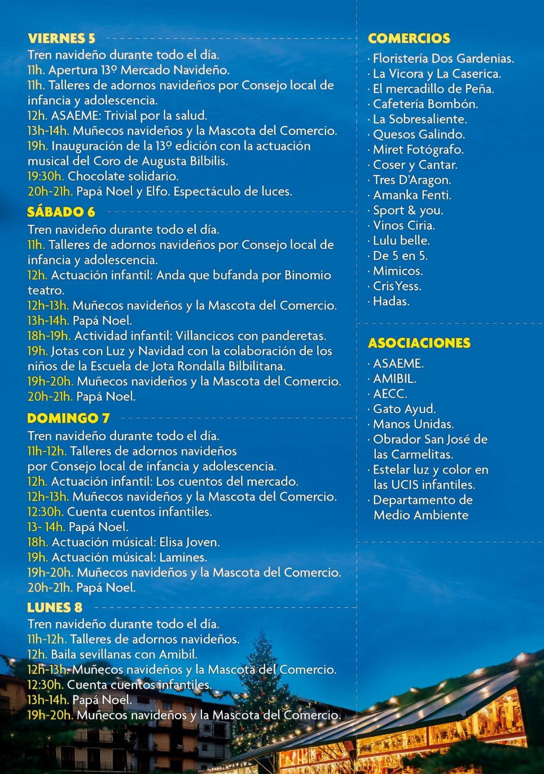 El horario de apertura del Mercado de Navidad será de 11.00 a 14.00 y 17.00 a 21.00 horas, salvo el lunes 8 que cerrará a las 20.00 horas. Todos los días circulará también el tren navideño y estarán los muñecos de Navidad, junto a Bilbi, la mascota del Comercio de Calatayud. No faltarán talleres navideños ni cuentacuentos.