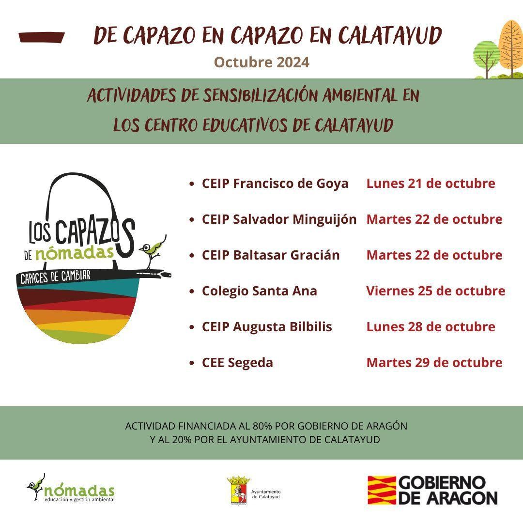 Las actividades se prolongarán hasta el día 29 y son impartidas por la empresa Nómadas Educación y Gestion Ambiental. Hoy empezaba en el Colegio Francisco de Goya, mañana de 10.00 a 11.30 estarán en el Salvador Minguijón. Al Baltasar Gracián llegarán el ese mismo día de 12.15 a 13.45 horas. En el Colegio de Santa Ana será el viernes 25 de 9.30 a 10,30 y  de 10,30-12,00. El lunes  28 serán de  9.00 10.30 y  de 10.30 a 12,00. El martes 29 “Capazos” estará en el Colegio Segeda entre las 10.30 y las 12.00 horas.