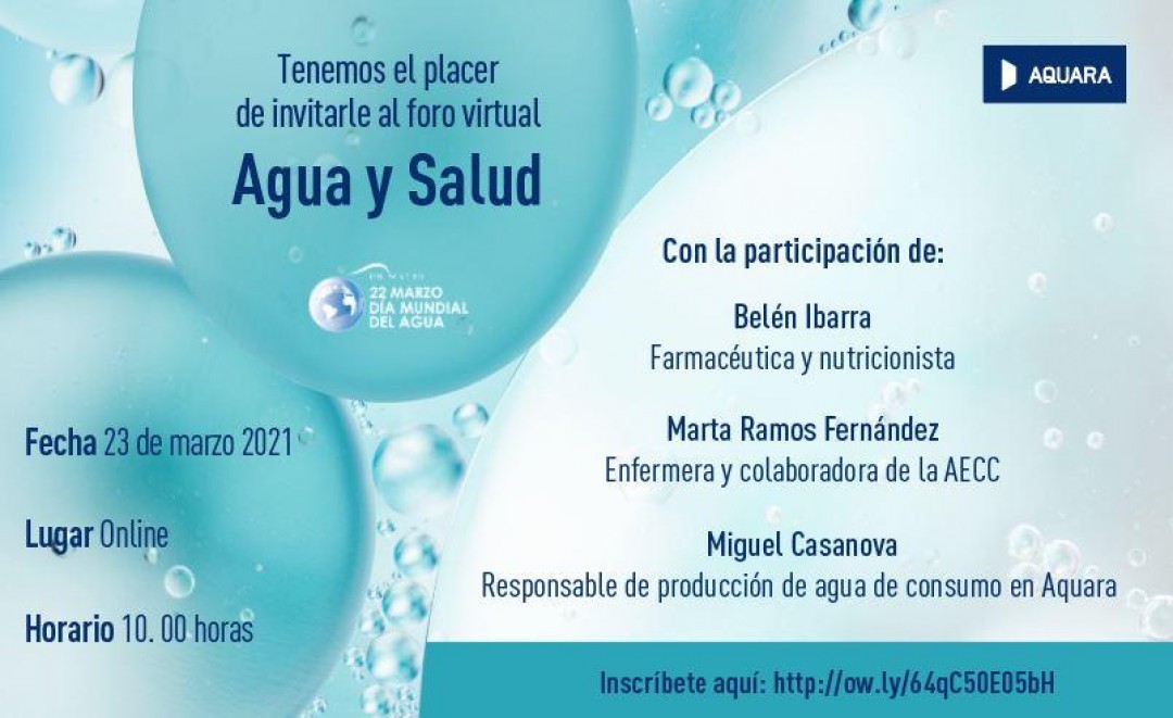 El binomio agua-salud cobra un especial valor en 2021 y por ello protagonizará el webinar que la empresa ha organizado para el martes 23 de marzo a las 10.00 horas. Belén Ibarra, farmacéutica y nutricionista; Marta Ramos, enfermera y colaboradora de la Asociación Española contra el Cáncer y Miguel Casanova, responsable de Producción de Agua de Consumo en Aquara, analizarán el papel del agua que juega el agua para la prevención de enfermedades y para la adopción de los hábitos saludables de vida. Todos los vecinos de Calatayud que estén interesados en participar pueden hacerlo registrándose previamente en el siguiente enlace: http://ow.ly/JmC050E0Wtb