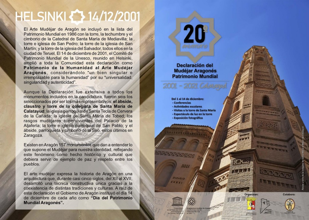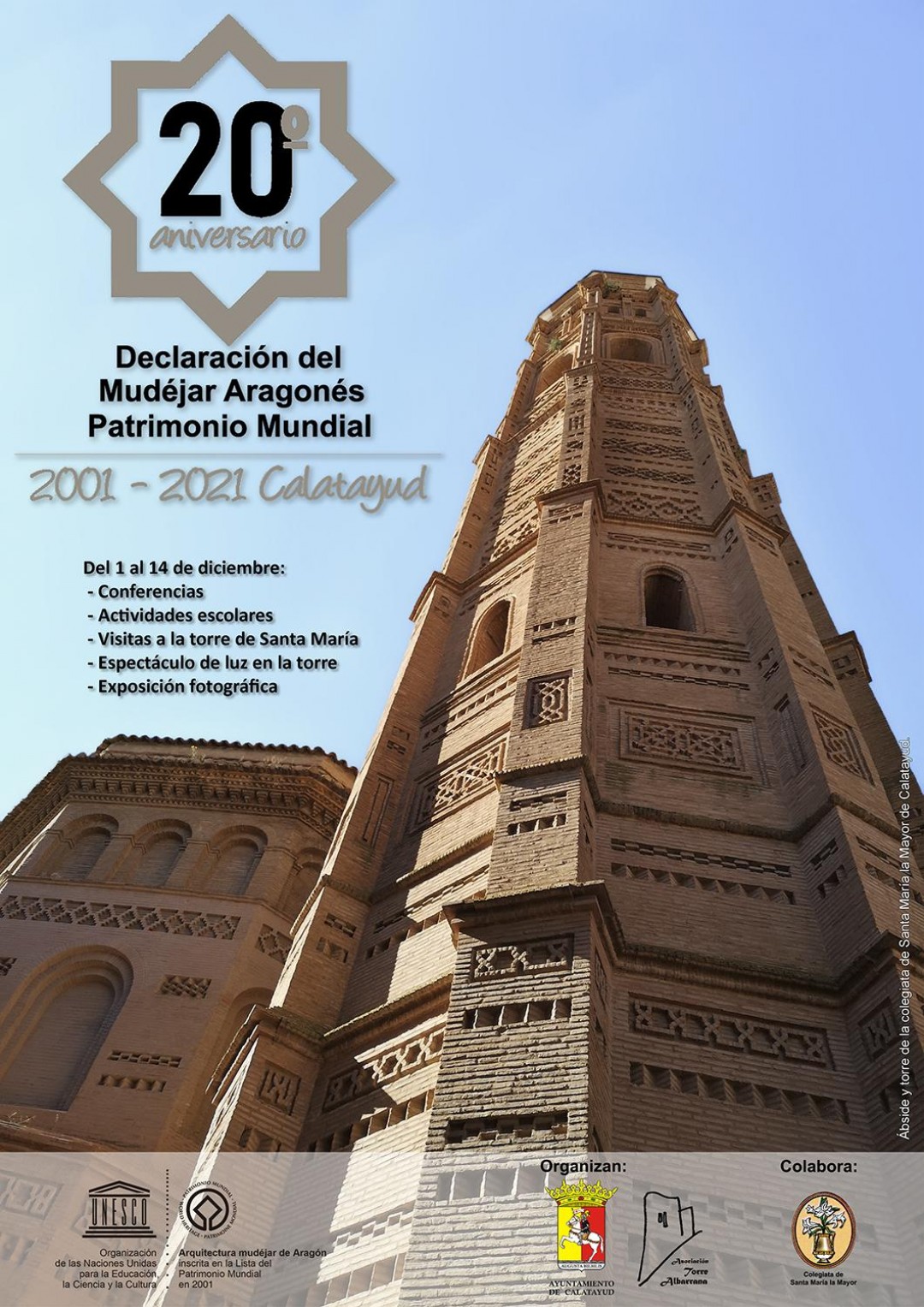 El Ayuntamiento de Calatayud y la Asociación Torre Albarrana han organizado un extenso programa de actos que se desarrollará en diciembreEl ábside, el claustro y la torre de la Colegiata de Santa María de Calatayud son monumentos considerados bienes singulares e irremplazables para la humanidad por la UNESCO, junto a otros edificios patrimoniales de Aragón. Esta declaración tuvo lugar el 14 de diciembre de 2001 y con motivo de su XX aniversario, el Ayuntamiento y la Asociación Torre Albarrana han organizado un amplio programa de actos con charlas, exposiciones, visitas guiadas y actividades para escolares.