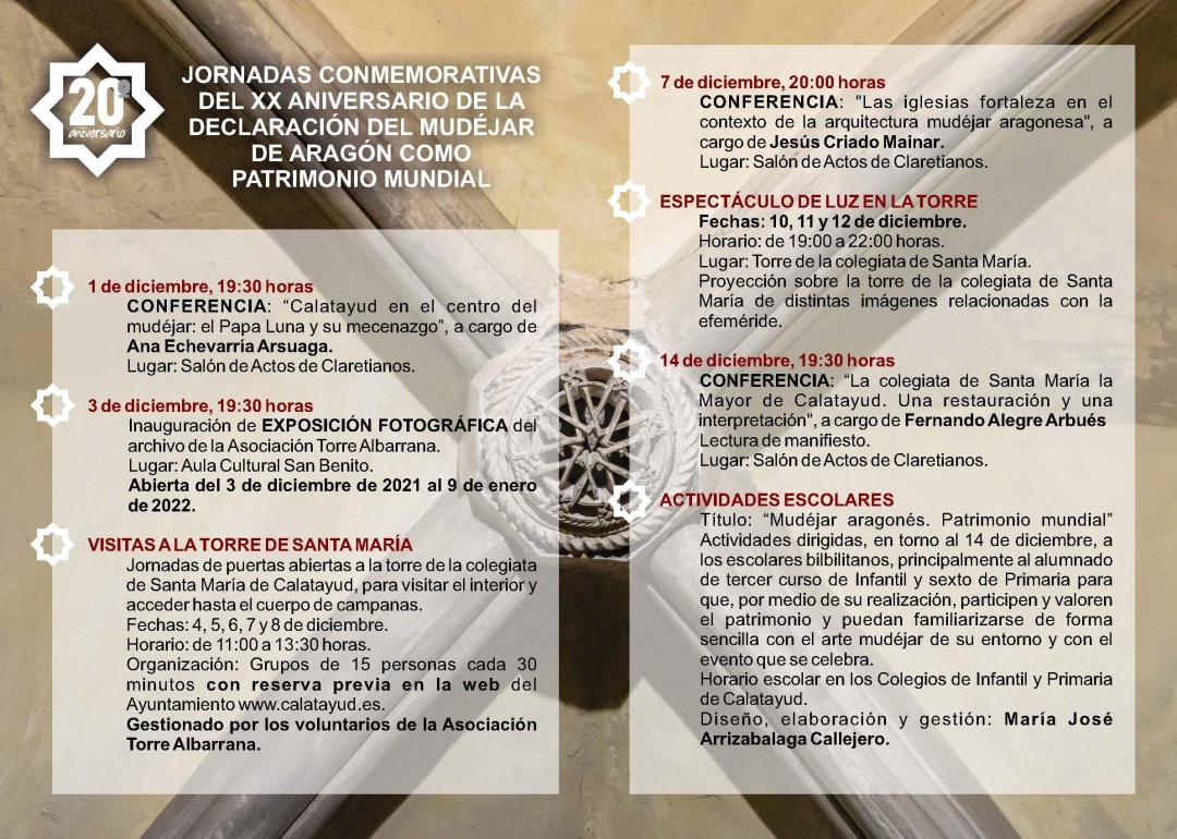 “Queremos aprovechar esta efeméride para acercar el arte mudéjar a la ciudadanía y poner en valor el relevante patrimonio con el que contamos tanto en la ciudad como en la comarca. Además este 20 aniversario llega en un momento especialmente dulce para el mudéjar bilbilitano, pues en muy poco tiempo celebraremos la apertura de la Colegiata de Santa María”, explica el concejal de Patrimonio, José Manuel Gimeno, que ha agradecido a la Asociación Torre Albarrana y a la parroquia de Santa María la labor realizada para poner en marcha estas jornadas.