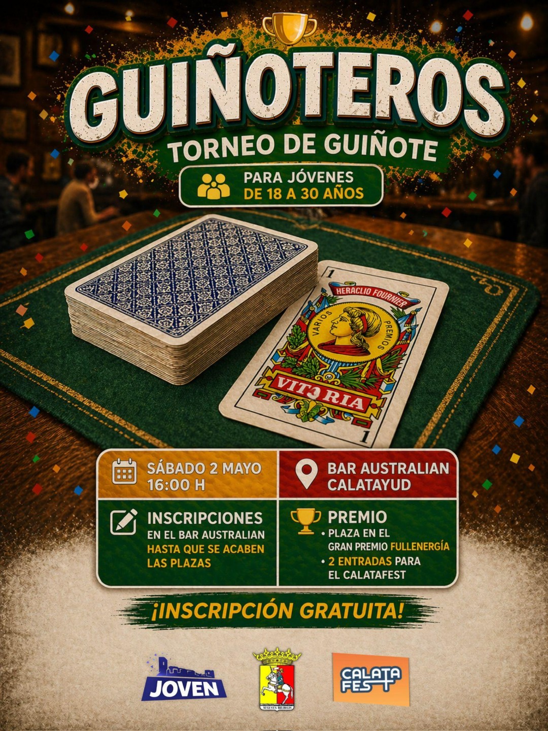 Por otra parte el sábado día 2 desde las 16.00 horas habrá un torneo de guiñote. “Guiñoteros”, se ha llamado y se jugará en el Bar Australian. Allí mismo se hacen las inscripciones y entre los premios, entradas para el CalataFest y plaza en el Gran Premio FullEnergia.