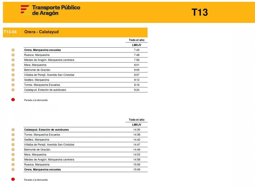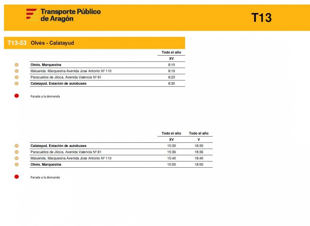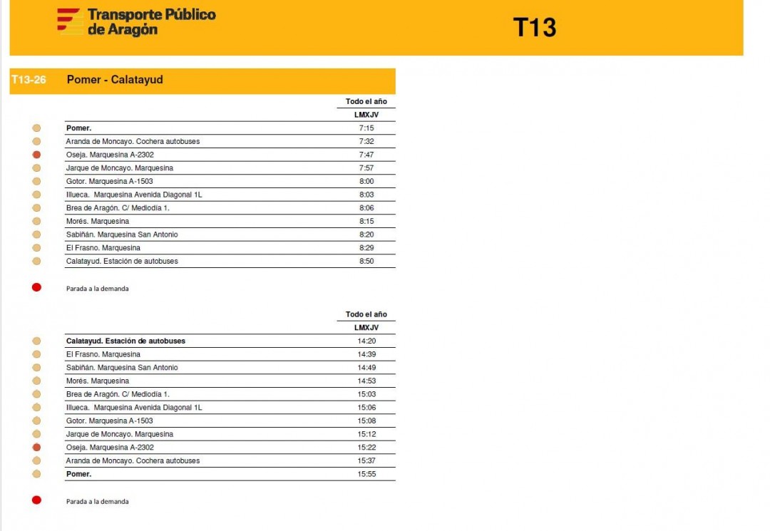 En este enlace pueden consultar los horarios de todas las rutas de la T13 de la Comunidad de Calatayud y el Aranda tal y como empezarán a funcionar este próximos lunes 15 de diciembre