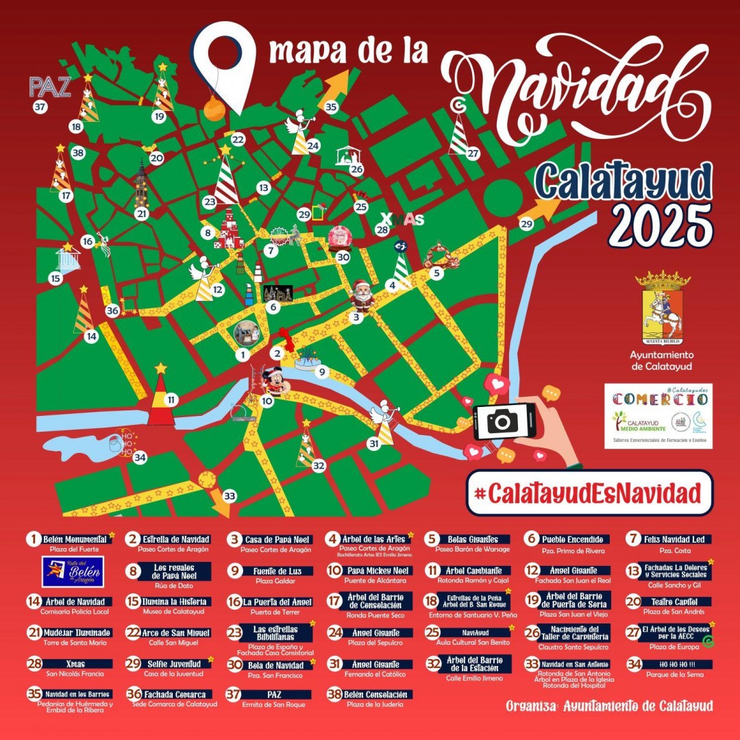 De esos 76 espacios, en 38 hay elementos adicionales en los que la decoración va más allá de la iluminación. “Son los photocalls, espacios escénicos buscados para las fotografías de Navidad y con los que entre todos difundimos Calatayud en instantáneas y redes sociales”, comenta Gimeno. Para contribuir a esa promoción se pide etiquetar como #CalatayudEsNavidad.