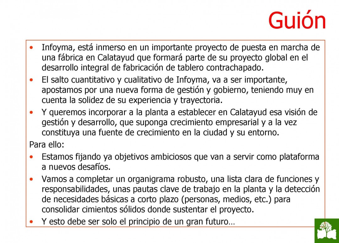 La primera fase del proyecto supone una inversión de 4,5 millones de eurosEl Grupo Infoyma SL, dedicado a la industria forestal y maderera, ha presentado el nuevo proyecto que pone en marcha en Calatayud. La firma con sede en Palencia se ubicará en las antiguas naves de Kimberly Clark, de propiedad municipal, que se encuentran en la zona industrial de Cuadras de Esteras.