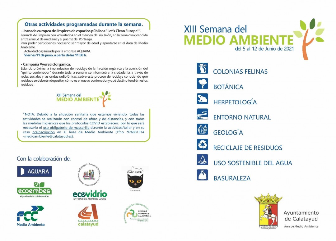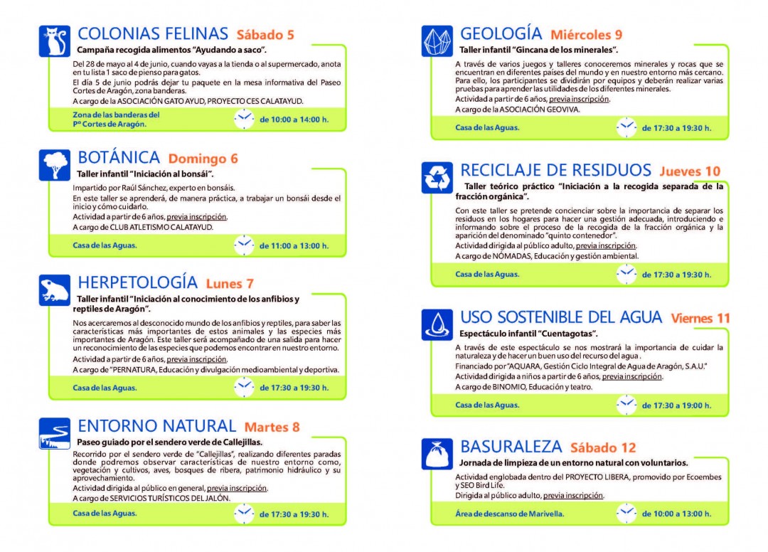 Todas las actividades requieren inscripción previaTalleres infantiles, espectáculos, campañas de recogida de alimentos, jornadas de limpieza, paseos guiados y muchas más actividades conforman el programa de la XIII Semana del Medio Ambiente de Calatayud. El próximo sábado 5 de junio, Día Mundial del Medio Ambiente, da comienzo un conjunto de actividades que se alargarán hasta el día 12 y pretenden concienciar a los bilbilitanos sobre el reciclaje y el cuidado de la naturaleza.