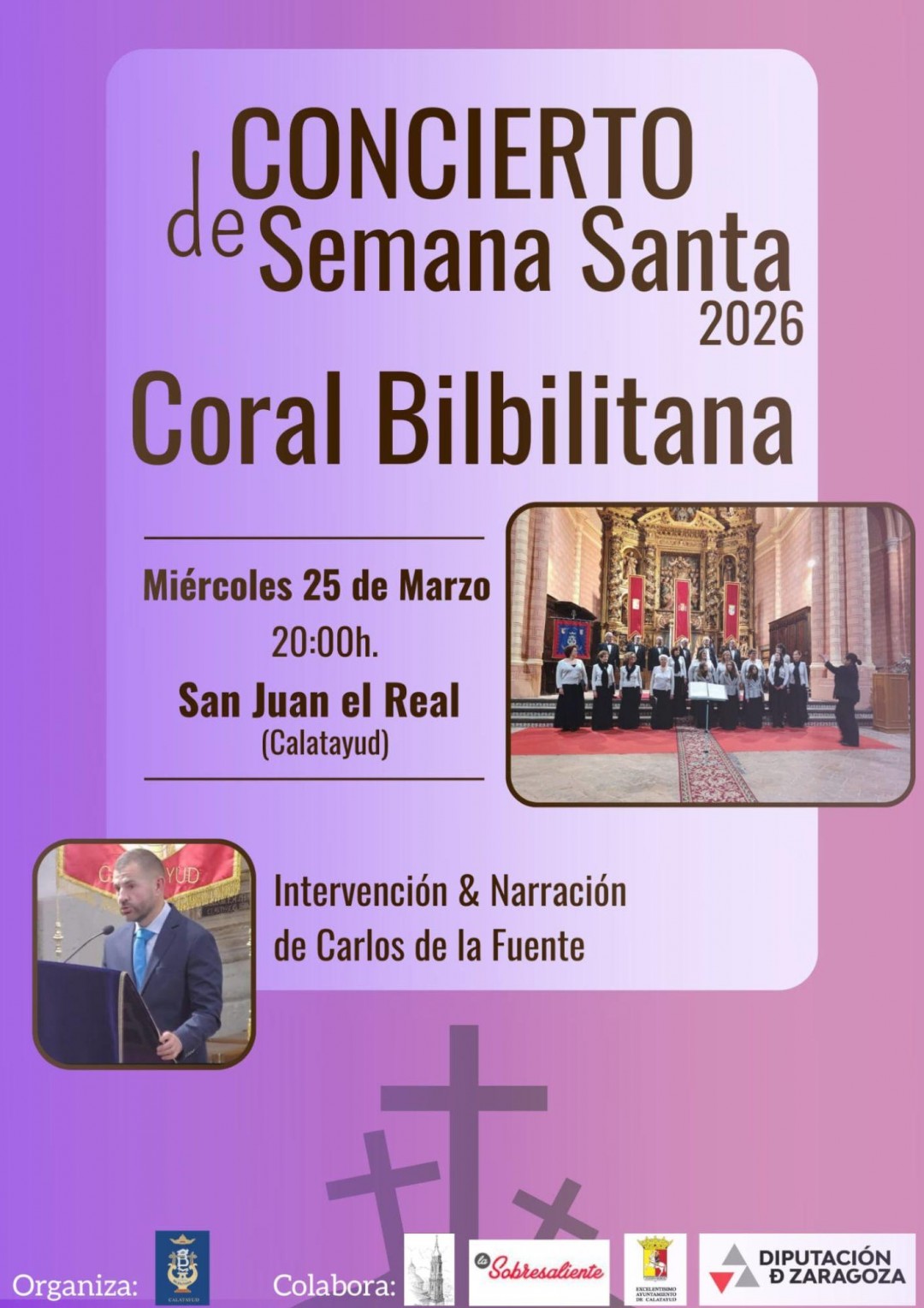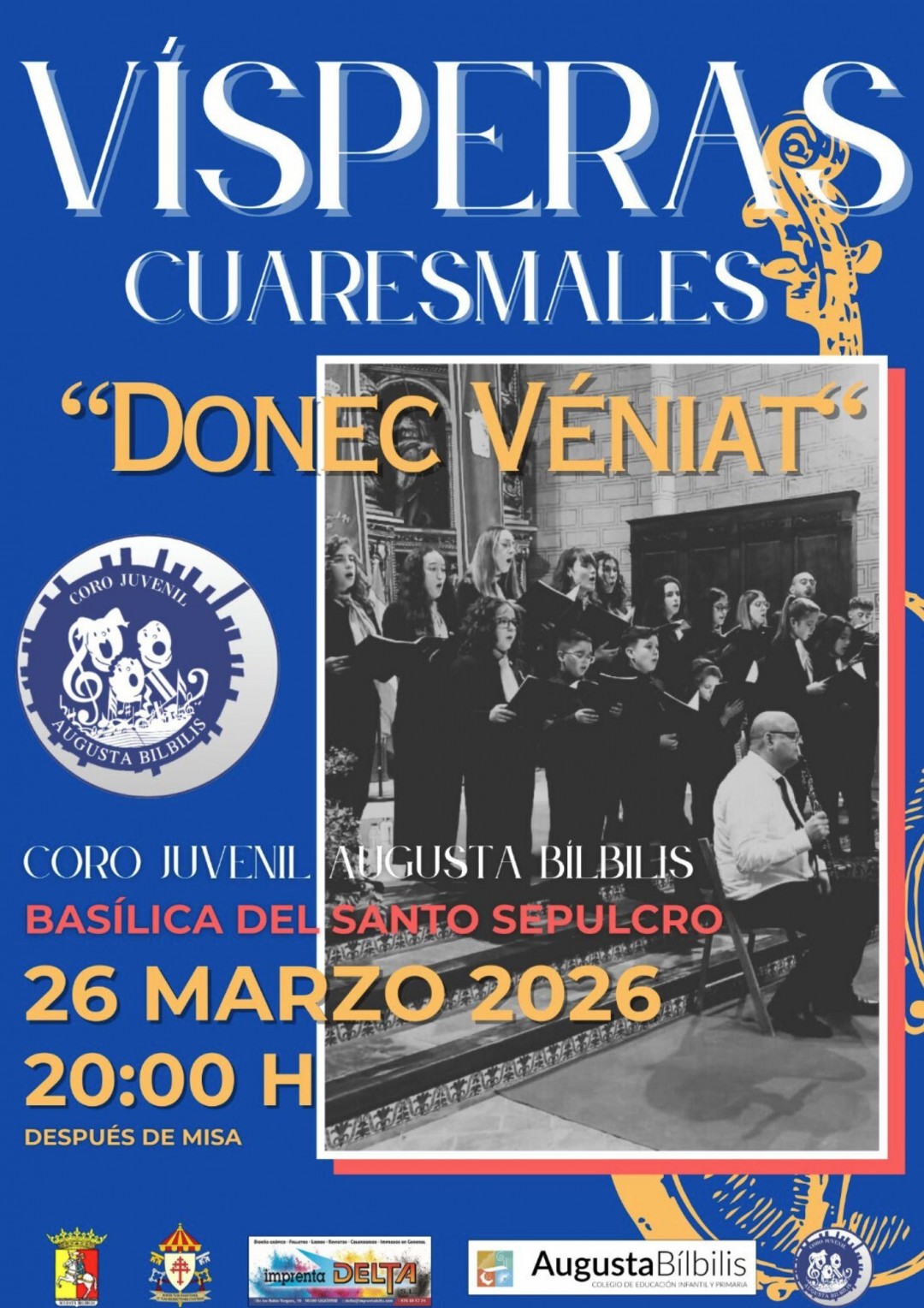 Los conciertos de Semana Santa los cerrará la Coral Juvenil Augusta Bílbilis el 26 de marzo a las 20.00 en la iglesia del Sepulcro. El director, Víctor Solanas, rememoraba los inicios de esta actuación dedicada a las “Visperas Cuaresmales”. Dieciséis años va a cumplir esta representación que se trata de una celebración no litúrgica y que es un concierto temático sobre la pasión y muerte de Jesús. Este año se iniciará con una composición sobre el Huerto de los Olivos que es más propio del Domingo de Ramos, cuando realmente empieza Semana Santa” decía Solanas. Las Vísperas tienen una introducción, un saludo celebrante y con posterioridad se introducen cada una de las estampas.