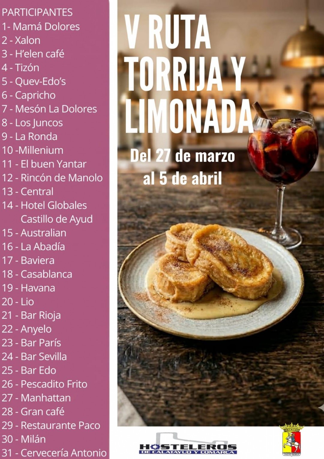 La Agrupación Musical Pascual Marquina abre la programación este sábado, y le seguirán las actuaciones de la Coral Bilbilitana y el Coro Juvenil Augusta Bílbilis.Esta tarde se han presentado las actividades que forman parte de la vertiente cultural de la Semana Santa bilbilitana. En una ciudad con una larga tradición musical y con agrupaciones implicadas en la dinamización de su ciudad, no pueden faltar los conciertos. Pero Calatayud es además un municipio de bares y con singularidades gastronómicas. La popular limonada con la que acompañar a las torrijas es una de ellas.
