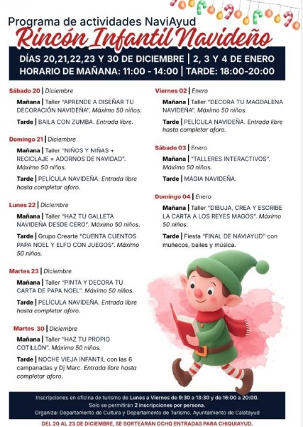 El Ayuntamiento amplía la oferta de actividades con este rincón, que se suma “Chiquiayud” para entretener a los más pequeños y conciliar durante las vacaciones.Esta Navidad viene con una novedad en la programación para los niños y jóvenes. A la tradicional y concurrida feria de “Chiquiayud” se une “NaviAyud”. Las dos citas organizadas por el Ayuntamiento, harán más fácil la conciliación de las familias y divertirán a la infancia y la adolescencia. Además, están todas las actividades que se programan en la Casa de la Juventud.